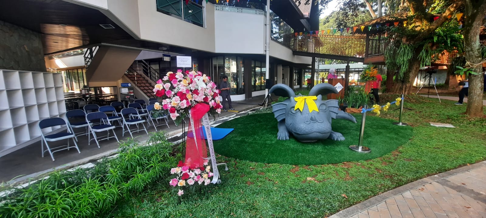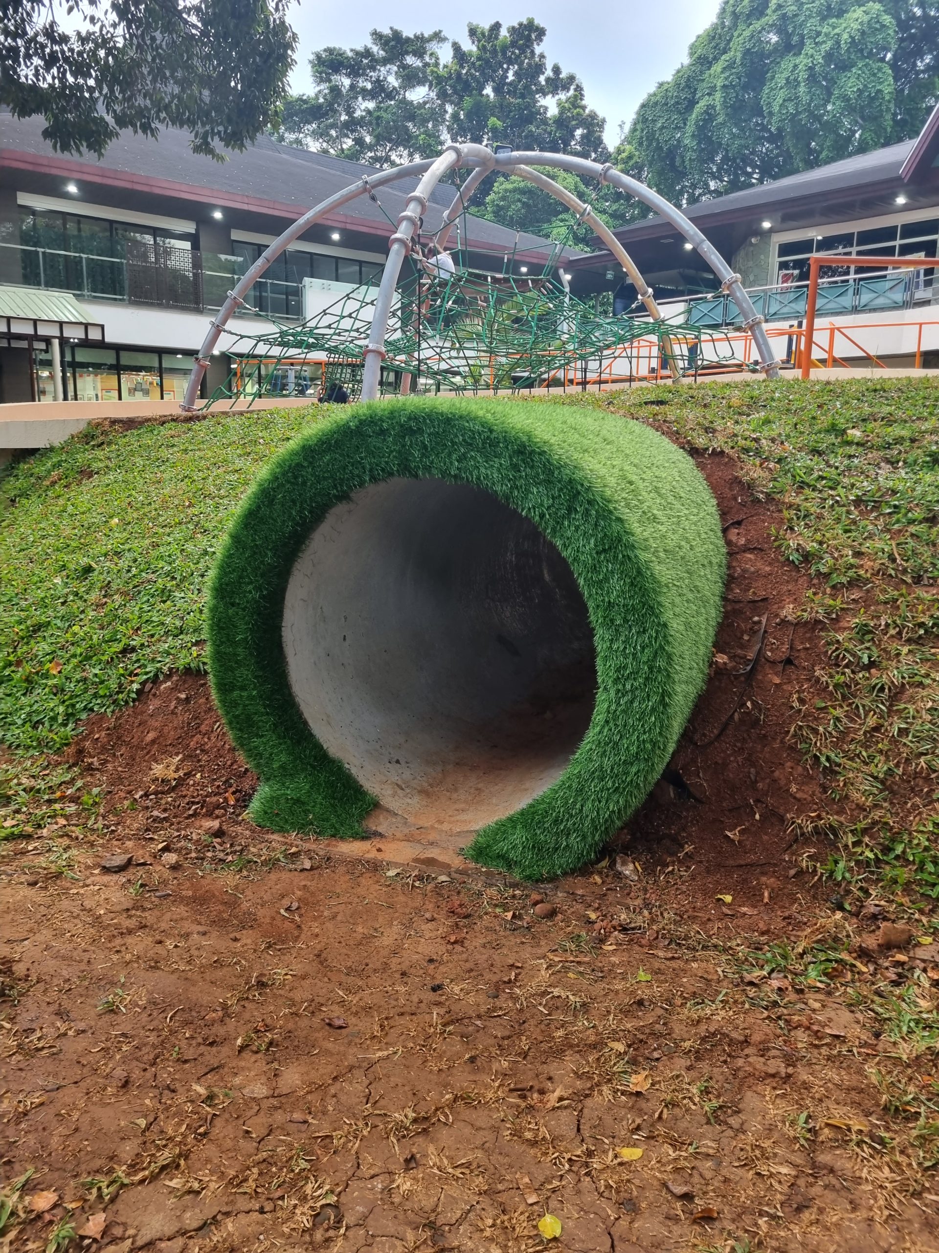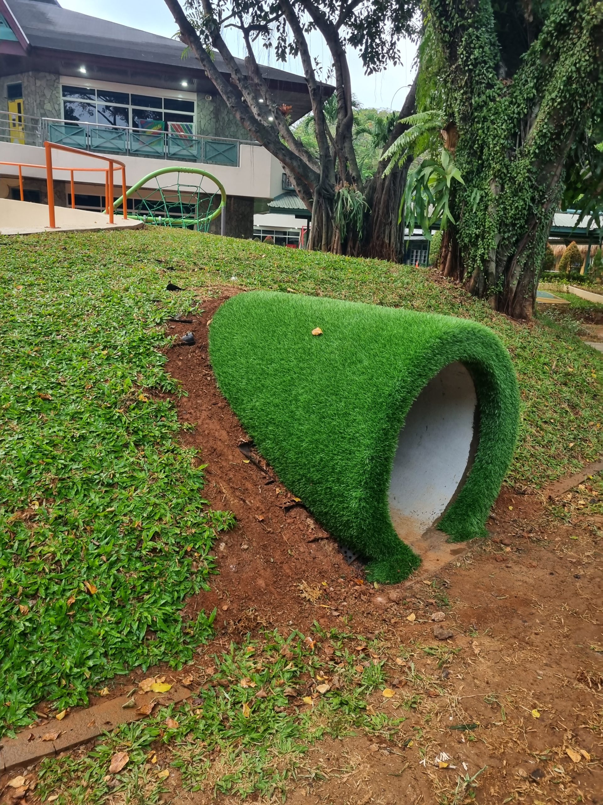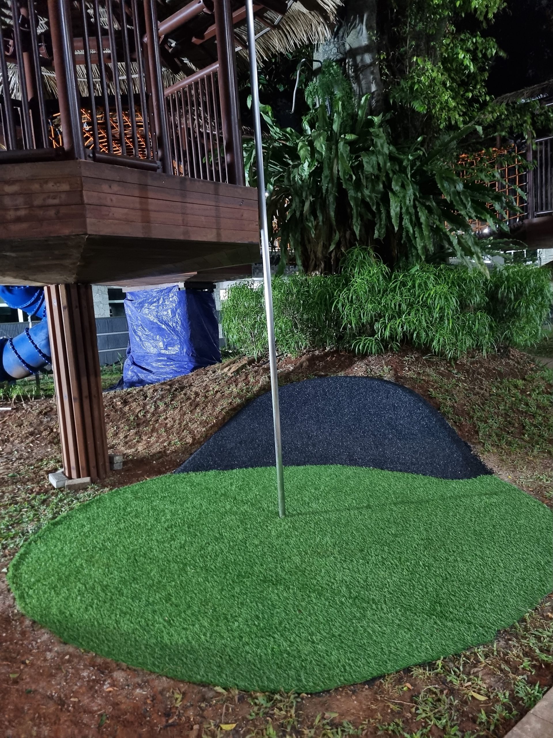 Flooring playground ini menggunakan 2 lapisan. Lapisan pertama menggunakan shockpad rubber dengan ukuran 110mm – 140mm, dan lapisan kedua menggunakan rumput sintetis taman dengan tinggi 250mm. Project ini berada di Jakarta Intercultural School Pondok Indah.